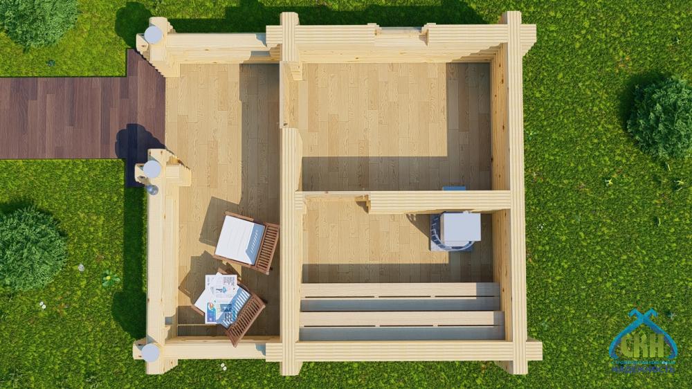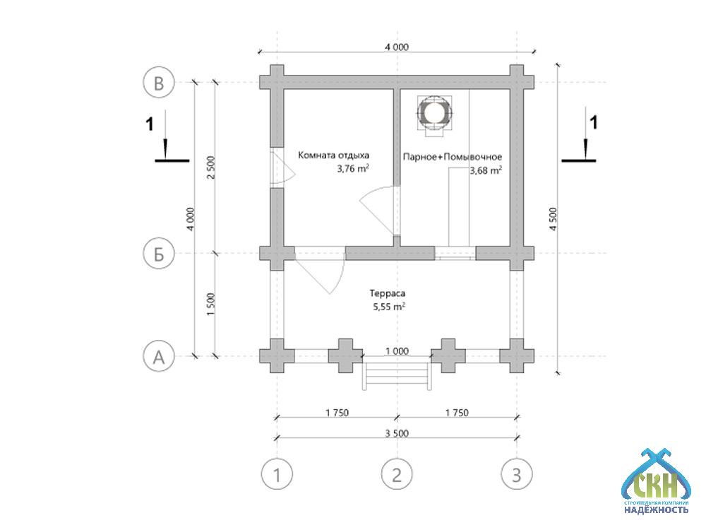 Изящная баня из оцилиндрованного бревна 4×4,5 воплощает стильность и практичность. Общая площадь достигает 12,99 кв. м., где парная занимает 3,68 кв. м., а помывочная — 3,76 кв. м.. Просторная комната отдыха в 5,55 кв. м. приглашает отдохнуть после бани. Вход оформлен через крыльцо. Дизайнерский проект создаёт уникальную атмосферу. Оздоровительный банный день становится ежедневной возможностью.