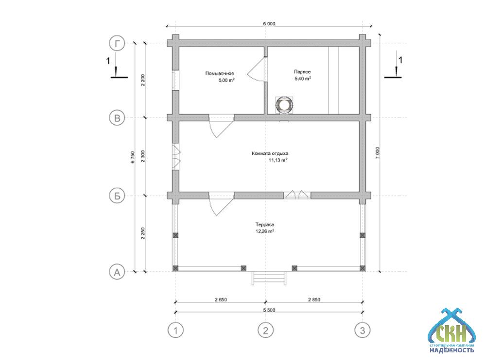 Баня из оцилиндрованного бревна 6×7 выделяется вместительностью и продуманностью. Общая площадь — 33,79 кв. м., парная — 5,4 кв. м., помывочная — 5 кв. м.. Комната отдыха на 11,13 кв. м. дополнена гостевой зоной на 12,26 кв. м.. Парная релаксация становится источником гармонии. Надежный застройщик обеспечивает уверенность в результате.