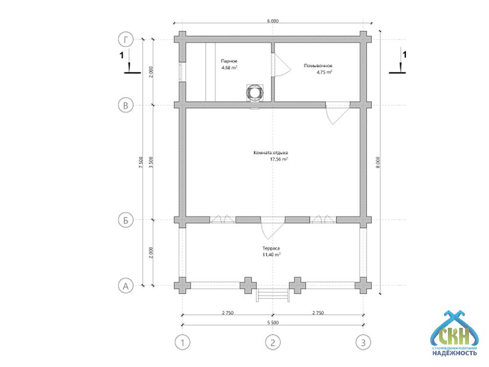 Баня из оцилиндрованного бревна размером 6х8 метров сохраняет дух деревенской традиции. Общая площадь — 38 кв. м., парная — 4,68 кв. м., помывочная — 4,75 кв. м.. Комната отдыха становится центральным местом для встречи гостей. Терраса добавляет уюта и гостеприимства. Банный комфорт достигается за счёт натурального дерева и продуманной компоновки. Вдохновение дизайнера воплощено в форме, линиях и пропорциях этой бани.