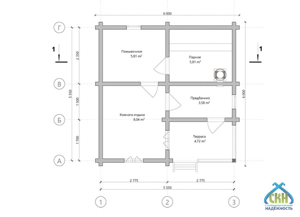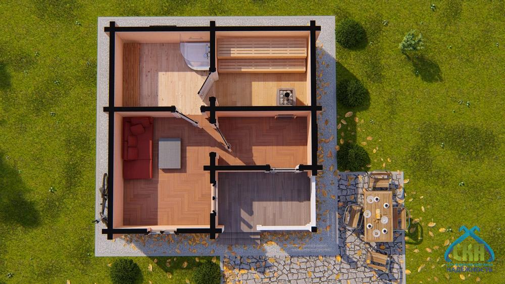 Баня из профилированного бруса 6×6 отличается интересной архитектурой и удобством. Общая площадь — 27,96 кв. м., парная и помывочная занимают по 5,81 кв. м.. Комната отдыха задумана как уютное и функциональное пространство, где после банных процедур можно с комфортом разместиться компанией или остаться наедине с собой. Терраса предлагает зону для лёгкого расслабления под открытым небом — здесь найдётся место и для чашки ароматного чая. Крыльцо выступает не только как элемент входной группы, но и как эмоциональный пролог всего проекта — оно встречает гостей с теплотой и приглашает внутрь. Форма крыши — двухскатная — выбрана не случайно: она подчеркивает современный характер архитектуры, обеспечивает удобство схода снега. Общий стиль строения — минималистичный и технологичный, без излишеств, но с вниманием к каждой детали.