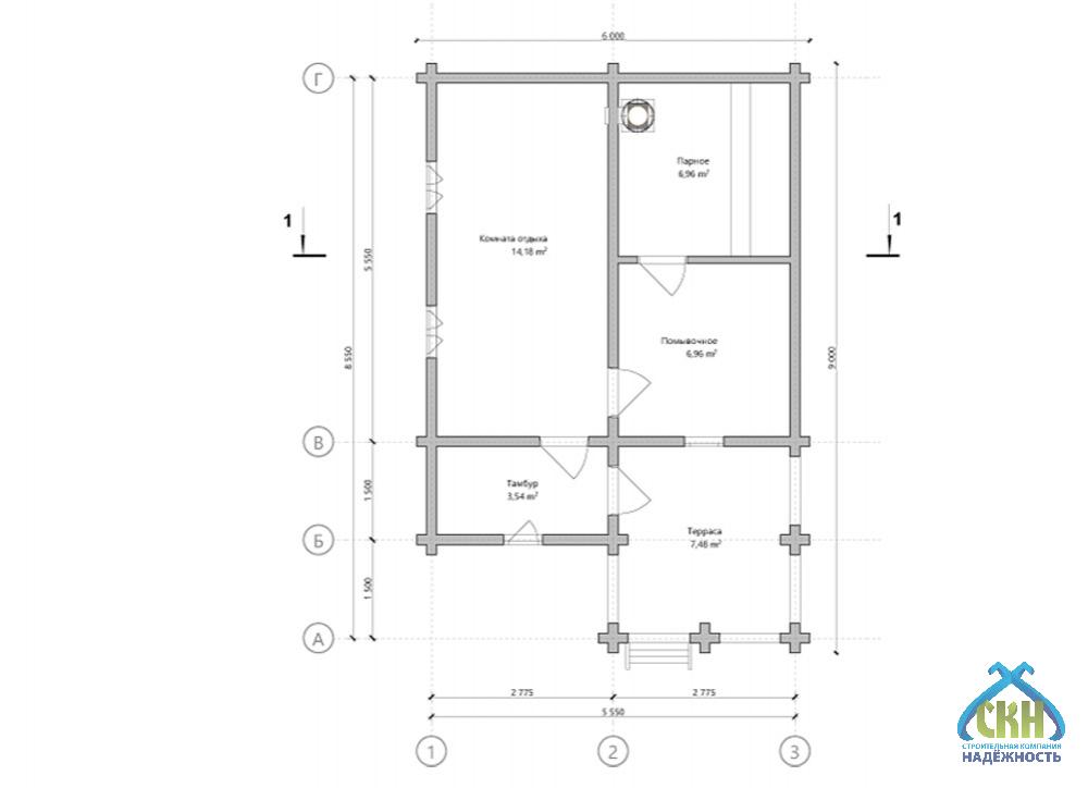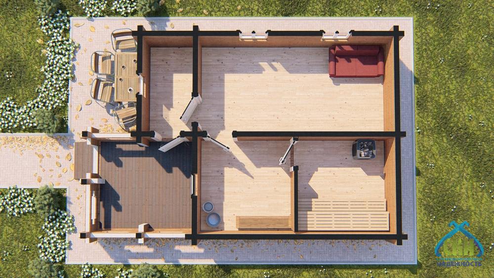 Баня из профилированного бруса 6×9 с двухскатной крышей сочетает вместительность и уют. Общая площадь — 39,12 кв. м., парная и помывочная занимают по 6,96 кв. м.. С каждым шагом по деревянным половицам чувствуешь, как забота об уюте воплощается в деталях — тёплый свет, мягкий аромат сосны, плавные линии пространства. Здесь, вдали от суеты, рождается особая атмосфера — где время замедляется, а душа находит своё отражение в тепле бани и гармонии материалов.