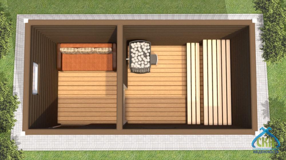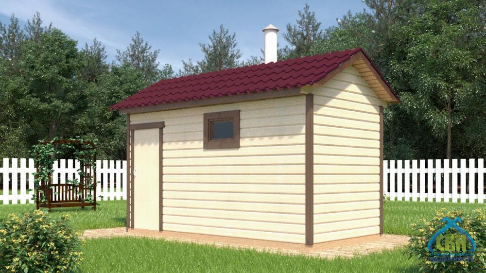 Каркасная баня 4х2 для тех, кто хочет пользоваться баней не только летом, но и зимой, у этой бани есть возможность для дополнительного утепления полов. Если Вы выбрали летнюю комплектацию, то потом можно утеплить самостоятельно и стены, сняв внешнюю обшивку, либо сразу заказать зимнюю комплектацию. Одна из самых недорогих бань для садоводов, очень компактная, удобно поставить на небольшом участке. В каркасной бане 2х4 есть небольшая комната отдыха и совмещенное отделение – парная с помывочной, что подходит для 2-3 человек. Эта недорогая баня пользуется большой популярностью. Построено более 200 штук в Нижегородской области.