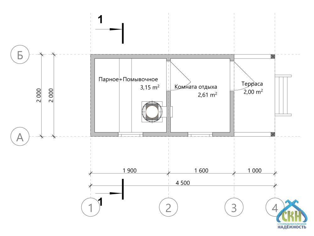 Изящная каркасная баня размером 4,5х2 метра оснащена открытой террасой и комнатой отдыха площадью 2 кв. м.. Общая площадь сооружения составляет 7,76 кв. м., помывочная — 3,15 кв. м., парная — 2,61 кв. м.. Баня выполнена в современном стиле и привлекает минималистичностью форм. Стиль и комфорт переплетаются в каждом элементе. Банный комфорт достигается благодаря детальному подходу. Вдохновение дизайнера нашло своё отражение в каждой линии этой конструкции.