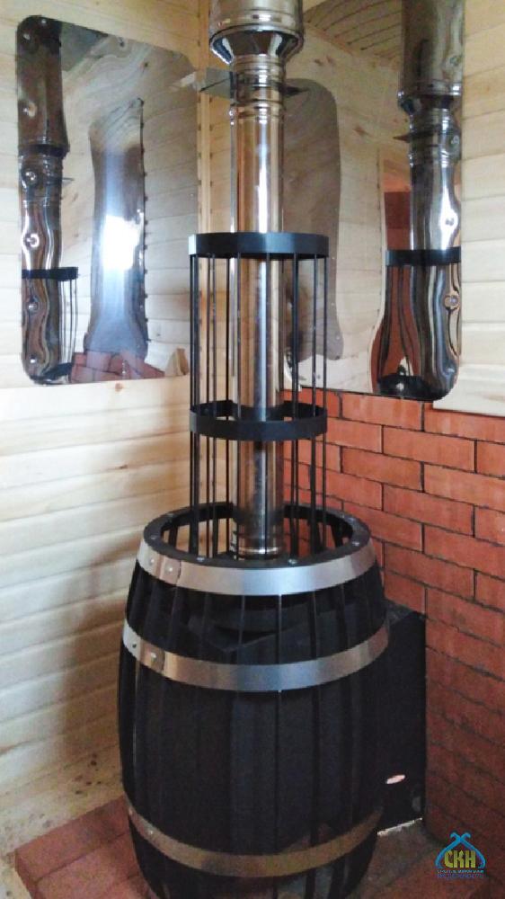Печь - Везувий Оптимум 14 (сталь 5 мм) с баком на трубе 55 литров из нержавеющей стали, двухконтурным дымоходом и комплектом пожаробезопасности. | |||