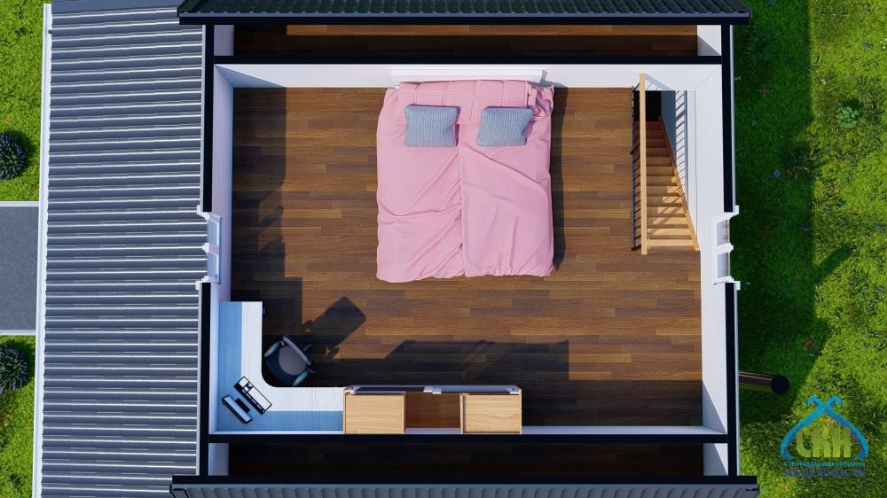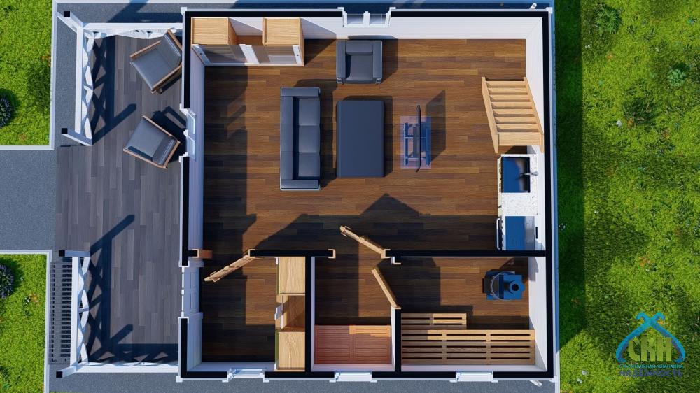 Каркасная баня-дом 6×8 двухэтажная с террасой имеет общую площадь 69 кв. м., включая совмещённую парную и помывочную 4 кв. м., комнату отдыха, тамбур, террасу, гостевые комнаты. Светлые уютные помещения создают атмосферу дома. Терраса становится любимым местом для общения после парной. Баня словно превращается в банную резиденцию. Здесь всё служит одной цели — расслаблению и восстановлению. Это пространство для отдыха, где каждый элемент продуман с заботой о Вас.