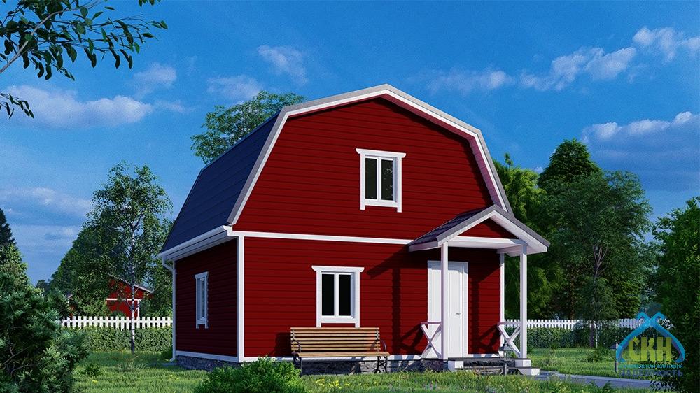 Каркасная дача отличается двухэтажной структурой и вместительными комнатами. Размер объекта —62,8 квадратных метра. Пространство для жизни составляет 38,8 квадрата. В доме 2 спальни. Гостиная с кухней создают открытую зону общения. Ломаный тип крыши создает неповторимый архитектурный стиль. Холл занимает 5,3 квадрата, в котором можно организовать дополнительную зону отдыха. Все материалы, применяемые при возведении, произведены из натурального дерева, что положительно влияет на микроклимат и экологию жилища. Это идеальное место для загородного домохозяйства, где найдётся уголок для каждого — от детской площадки до мастерской.