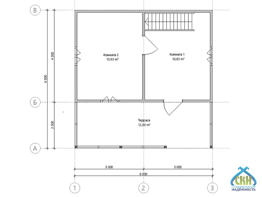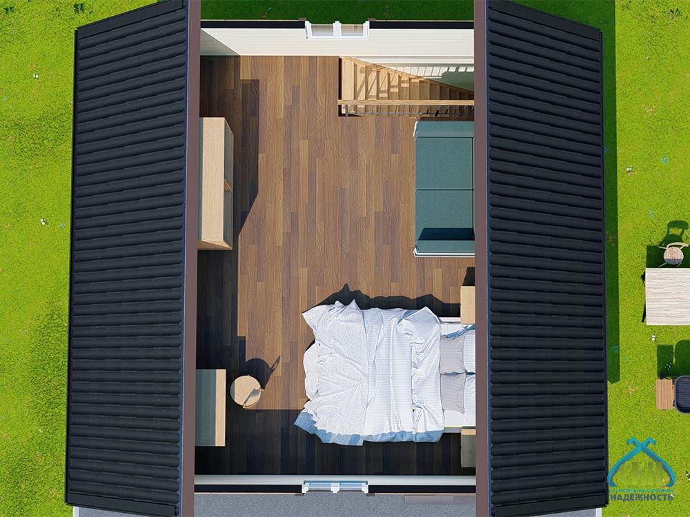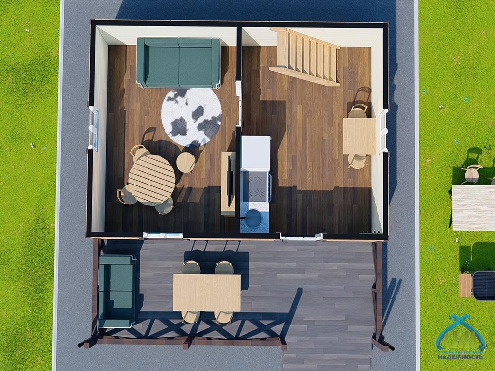 Каркасный дачный дом представленного проекта имеет площадь застройки 36 м2. Его конструктивную основу составляет усиленный каркас из бруса сечением 50х100 м, установленный с шагом 590 мм. Возможные варианты теплоизоляции стен плитным утеплителем: толщиной 50 мм для летней эксплуатации здания и 100 мм для всесезонного проживания. Строение имеет двухскатную крышу с покрытием профнастилом или металлочерепицей. Планировка помещений включает 3 комнаты: 2 на первом этаже и 1 на мансардном. К зданию примыкает терраса под навесом, на которой в теплое время года можно организовать зону отдыха на свежем воздухе.