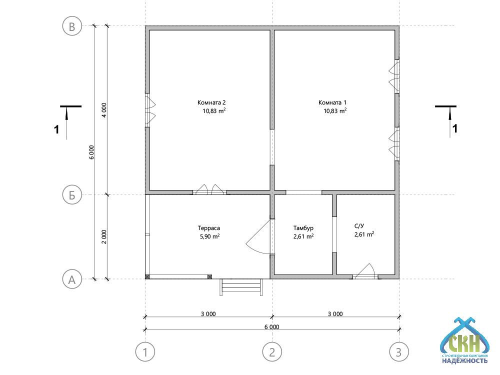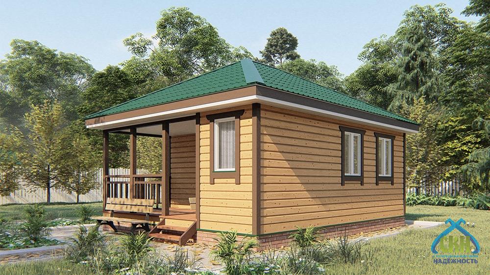 Одноэтажный дом предлагает оптимальное сочетание цены и качества. Объём площадей равен 32,8 квадратных метра. Пространство для жизни составляет 10,8 квадрата. В доме 1 спальня и комбинированная зона кухни с гостиной. Вальмовая крыша устойчива к ветровым нагрузкам и смотрится очень эффектно. 6 квадратных метров отведено под террасу. Современный внешний вид здания создаёт эффект индивидуальности и эстетического восприятия. Летний отдых здесь становится настоящим праздником — жарким днём в доме, вечером на просторной террасе.