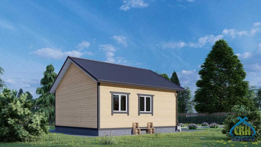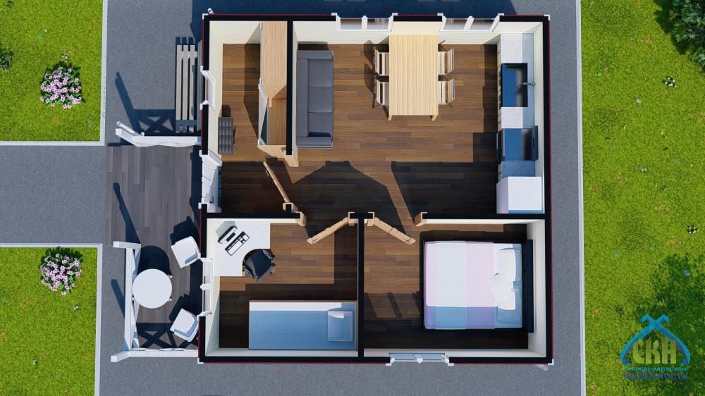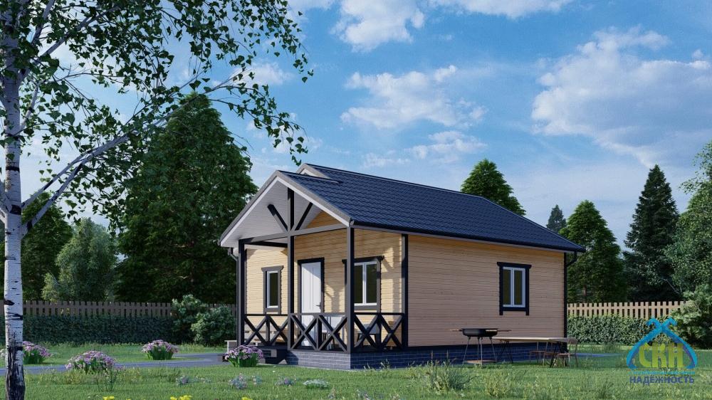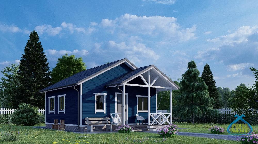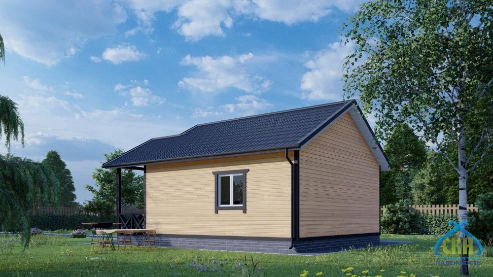 Компактная одноэтажная дача предназначена для умеренного климата. Размер строения —38,5 квадратных метра. Жилое пространство составляет 13,4 квадрата. В доме 2 спальни и объединённая кухня с гостевой зоной. Просторная терраса создаёт зону отдыха на свежем воздухе. Крыша выполнена в классическом двухскатном исполнении. 4,5 квадратных метра занимает тамбур, который защитит от холода, дождя и ветра. Это идеальное место для семейного отдыха, где каждый найдёт себе занятие по вкусу. Огородные дела станут приятным занятием, когда есть надежное и уютное укрытие.