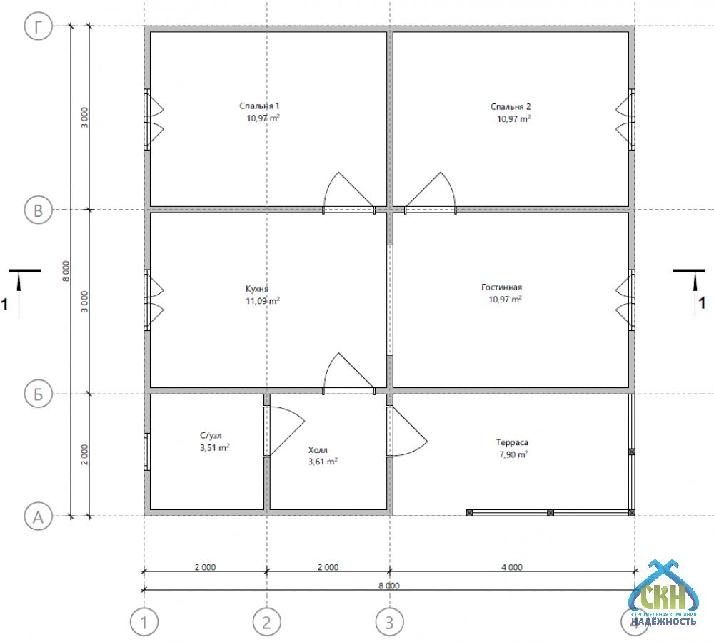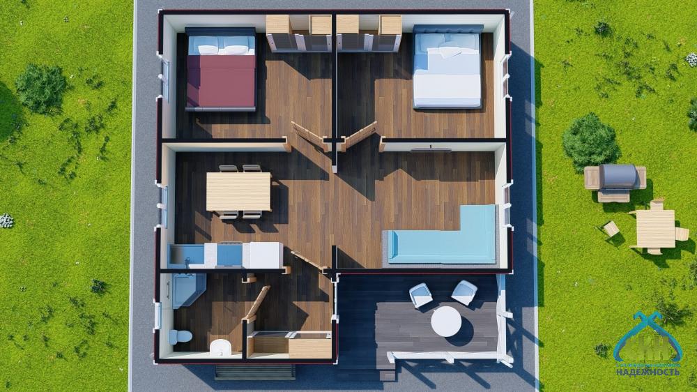 Дача по каркасной технологии имеет одноэтажную конструкцию и практичную внутреннюю структуру. Общая площадь равна 59,0 квадратных метра. Жилая площадь составляет 32,9 квадрата. В доме 3 спальни, что позволяет комфортно разместиться всем членам семьи. Кухня объединена с гостевой зоной. Вальмовая крыша повышает устойчивость к ветру. Строительство выполняется точно в срок, что подтверждается множеством успешно завершённых объектов. Огородничество станет приятной частью жизни — сажайте картофель, клубнику и цветы, создавая красоту своими руками, а отдыхайте в доме со всеми удобствами!