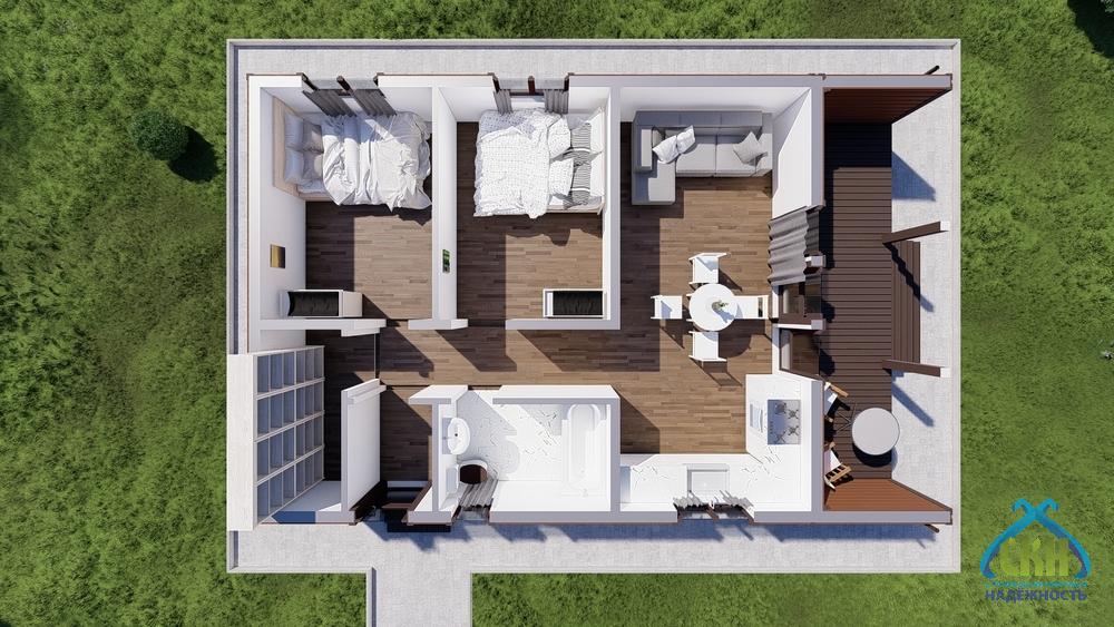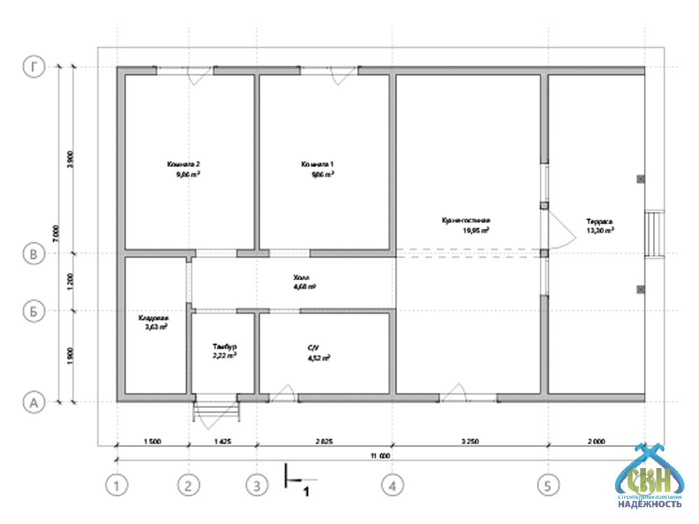 Каркасный дом 11х7 метров предлагает удачное сочетание уюта, рациональной планировки и прочности для круглогодичного проживания. Общая площадь дома 65 кв. м включает 2 спальни, санузел, холл, просторную кухню-гостиную 20 кв. м. с выходом на террасу, которая задаёт тон всему дому и станет местом семейных завтраков и вечерних чаепитий. Панорамные окна и большие стеклянные двери обеспечивают эстетику и уникальный архитектурный стиль здания. Строительство — по договору точно в срок, а проект разработан так, чтобы сохранить разумную цену без потери качества. Пространство продумано до мелочей — для жизни, общения и уединения.