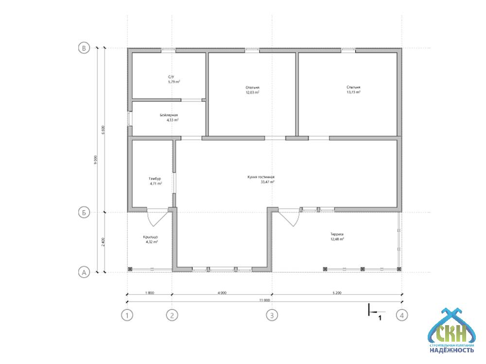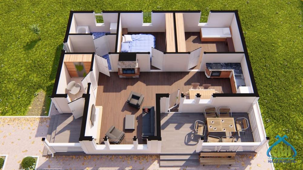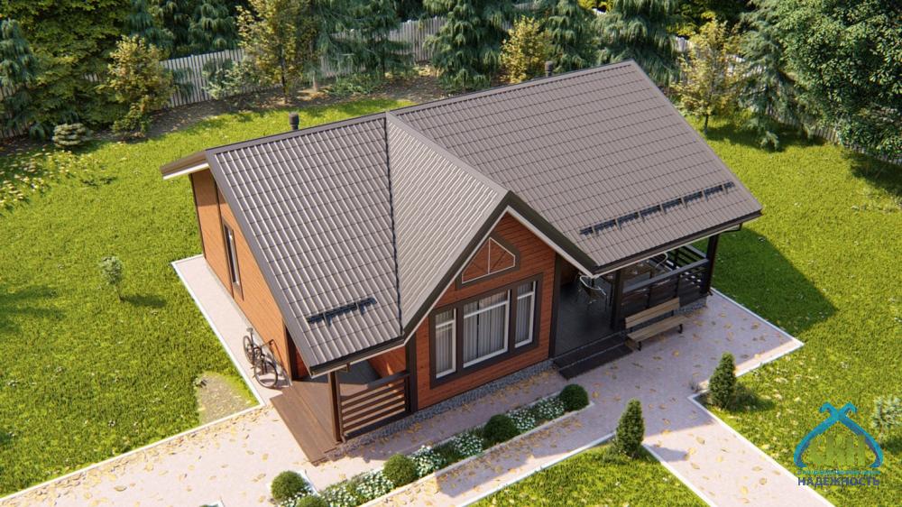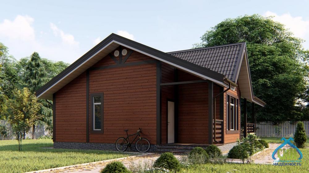 Одноэтажный загородный дом настоящего проекта имеет площадь застройки 11х9 м. Конструктивную основу здания составляет усиленный каркас из бруса. Утепление стен позволяет использовать дом для всесезонного проживания. Планировка помещений включает тамбур, кухню-гостиную, бойлерную, санузел и две спальни. К зданию примыкает терраса под навесом, на которой в теплое время года можно организовать зону отдыха на свежем воздухе.