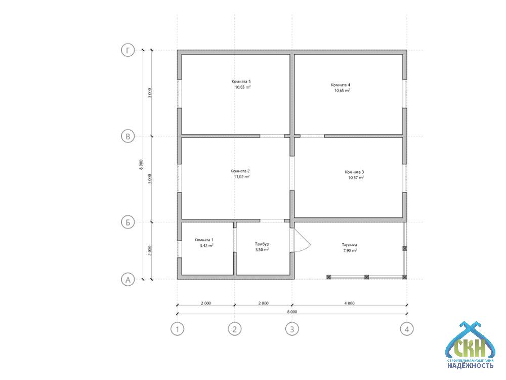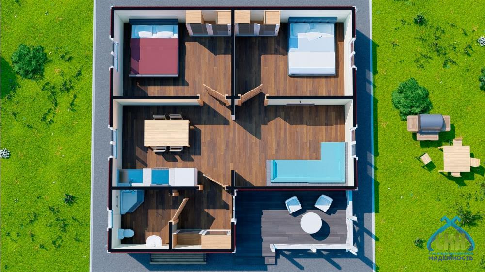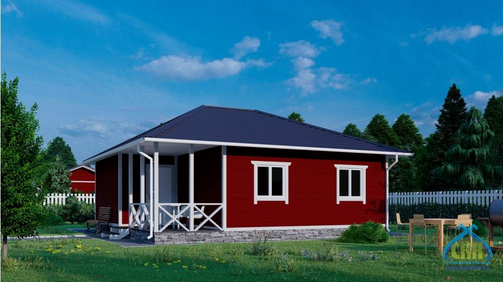 Одноэтажный загородный дом полезной площадью около 60 кв. м. и размером 8х8 м. Конструктивную основу здания составляет усиленный каркас из бруса сечением 50х150 мм или 50х200 мм (в зависимости от комплектации), установленный с шагом 590 мм. Утепление стен позволяет использовать дом для всесезонного проживания. Строение имеет вальмовую крышу, которая покрывается профлистом или металлочерепицей. Проектом предусмотрены пластиковые окна и входная металлическая дверь. Планировка помещений включает 3 комнаты, кухню-гостиную, санузел и тамбур. Высота потолков составляет 2,5 м. К зданию примыкает терраса под навесом площадью 7,9 м2, на которой в теплое время года можно организовать зону отдыха на свежем воздухе.