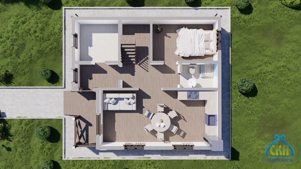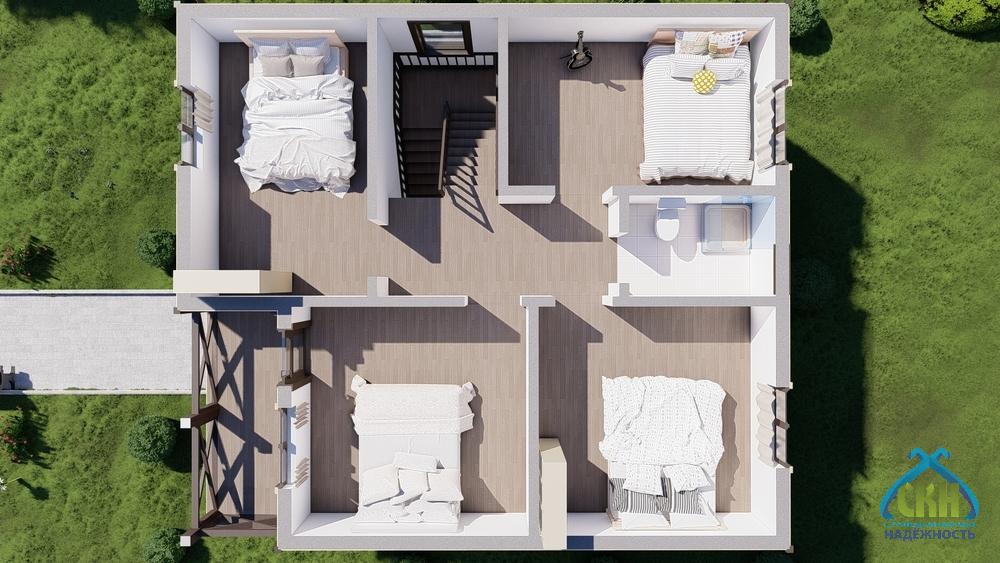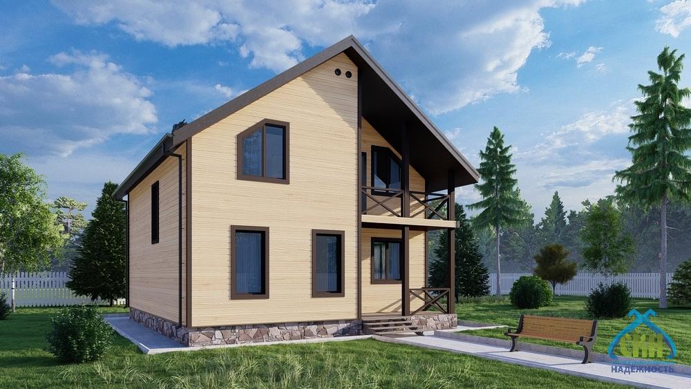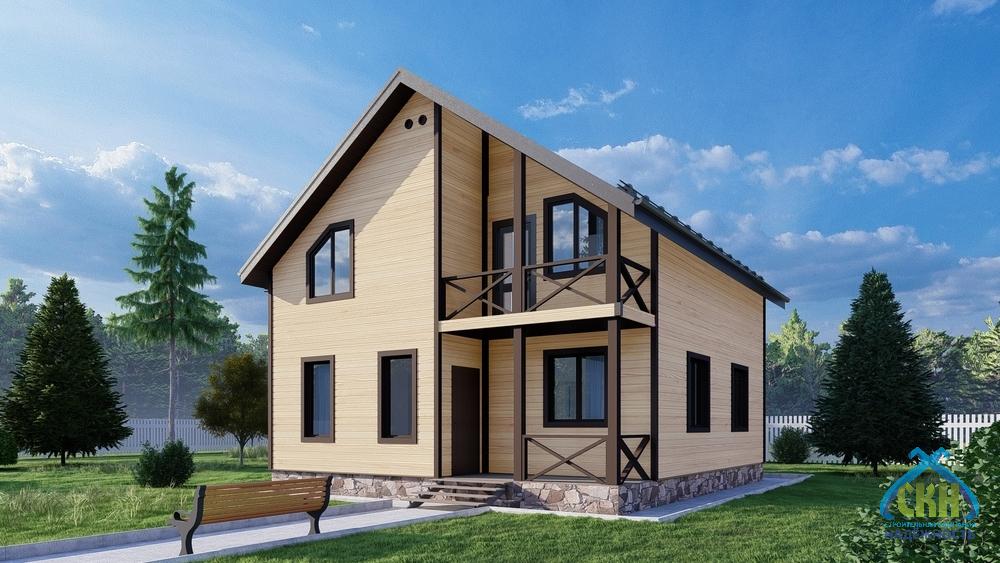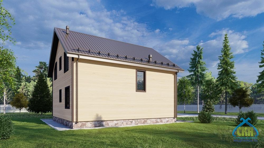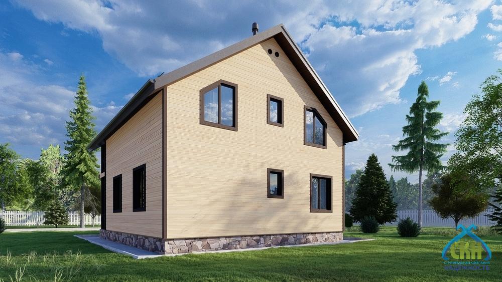 Загородный дом 125 кв. м. имеет размеры 8х9 м. В здании 2 этажа. На первом этаже размещены: жилая комната, котельная, санузел, кухня-гостиная, холл и тамбур. Еще 4 спальни находятся на мансарде, куда ведет внутренняя лестница. Жилая площадь составляет 55 кв. м. К зданию примыкает крыльцо площадью 5 м2, на котором в теплое время года можно организовать небольшую зону отдыха. Утепление стен позволяет использовать дом для всесезонного проживания.